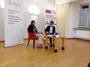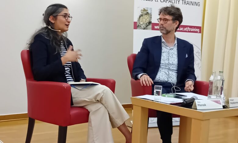 هولجر هيسترماير أستاذ القانون الدولي وقانون الاتحاد الأوروبي قدم الضيفة وأدار المناقشة معها ومع الجمهور.